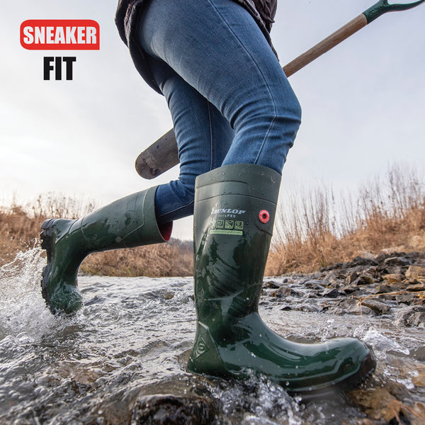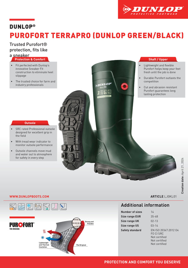 Get unparalleled protection and comfort with the Dunlop Purofort Terrapro. Made in Europe, this innovative gumboot is 30% lighter than regular boots, guaranteeing all-day comfort without compromising safety. Now fitted with Dunlop's new sneaker fit, this boot elimainates heel slippage and will offer next level comfort. The SRC rated outsole provides excellent traction on uneven surfaces, reducing the risk of slips and trips. Navigate any terrain with utmost confidence, safety, and ease with Purofort+.