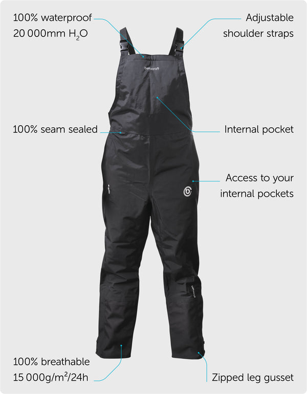 9037-BLK-XSWear it in the paddock, on the hill or around the yards. Go everywhere it rains and stay dry while doing it! These bib-overtrousers feature a higher-rise back panel, keeping you warmer and drier and making the shoulder straps less prone to tangling. With open access side pockets and zipped chest pocket.
