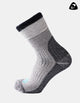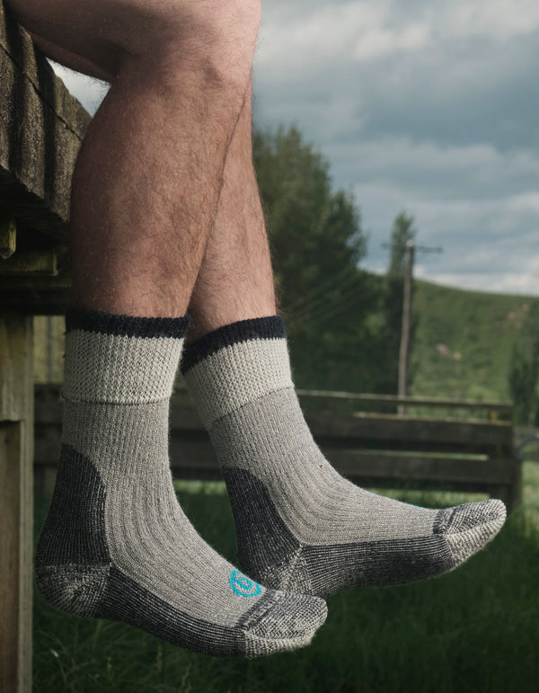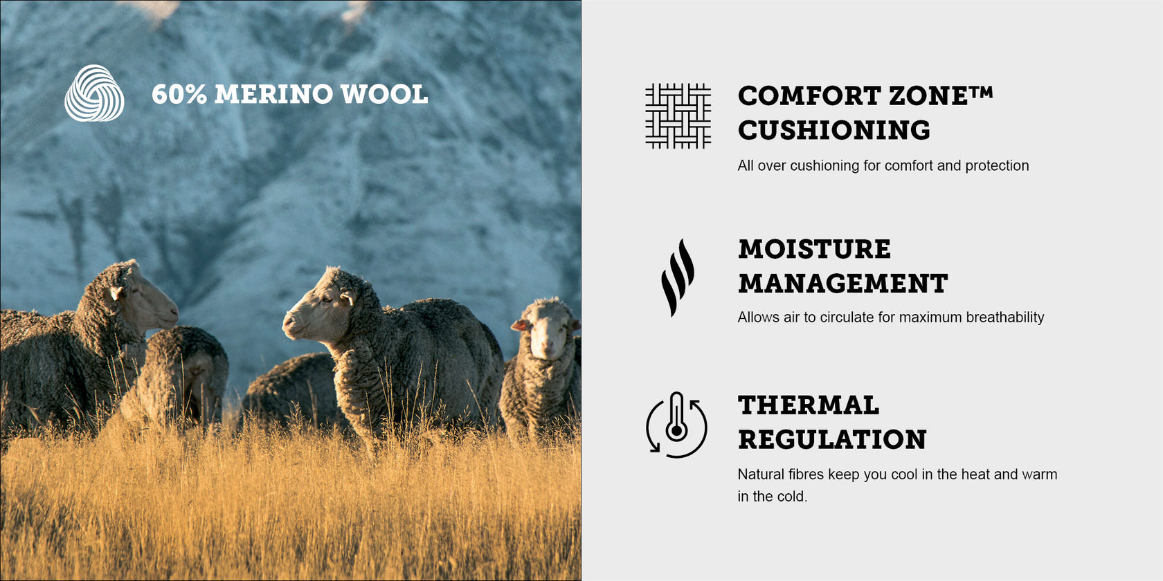 Wear-resistant Nylon reinforcing has been blended on the outer for durability and undyed Merino is knitted on the inner of the sock. The darker panels on the sole of the sock represent additional nylon reinforcing.