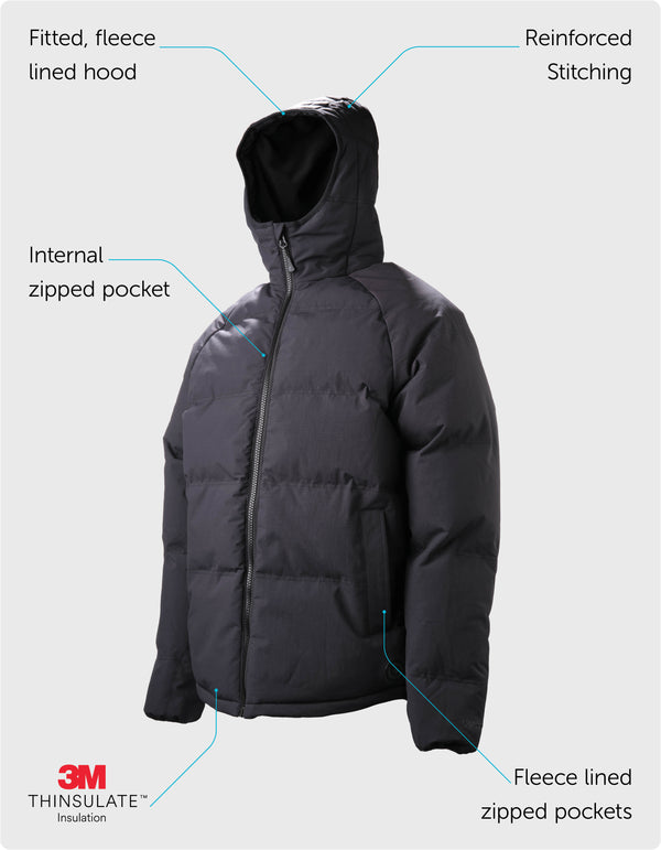 A sleek patterned lining, surrounded by easy to care for 3M Thinsulate fill, wrapped in a tough water resistant shell.
